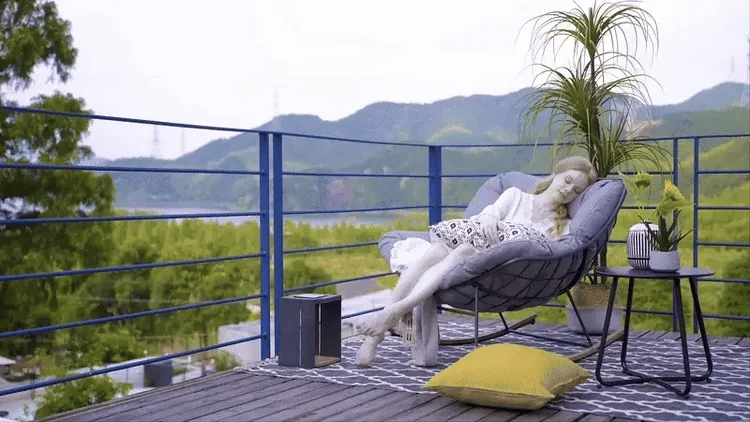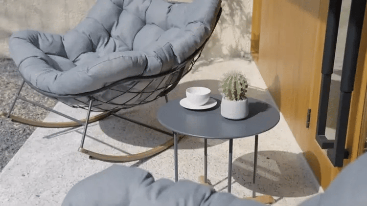 Our rocker chair has a strong and durable steel frame, the main chair frames are powder-coated to combat water, UV rays, and rust. Spun polyester fabric on the cushions is resistant to stains, water, and UV rays, keeping your patio furniture set looking pristine season after season.
